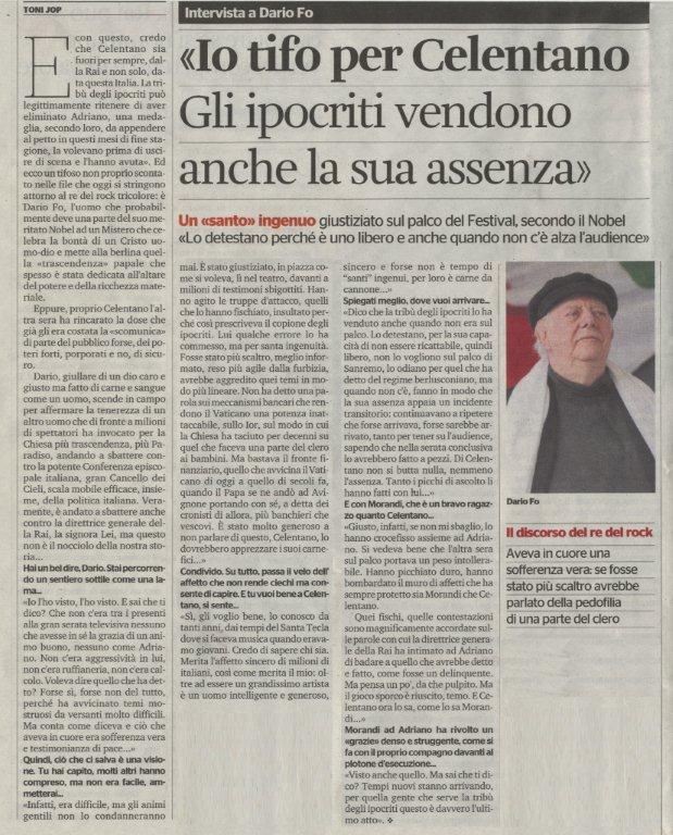 Mancuso di schiera a sorpresa ma non troppo a favore delle esternazioni con cui il cantante ha choccato Sanremo e buona parte dei cattolici italiani. Nel momento in cui dice che i preti dovrebbero fare di più il loro mestiere di uomini dello spirito, capaci di toccare i problemi primi e ultimi dell’esistenza, del Paradiso e della vita eterna, anziché parlare di politica, “difficile dargli torto”. “Celentano? un personaggio a volte discutibile, ma sempre interessante, un credente alla sua maniera, probabilmente se non avesse fatto la battuta ‘bisogna chiudere Avvenire e Famiglia Cristiana’, ma semplicemente che i due giornali vanno fortemente riformati, se non rivoluzionati, non avrebbe suscitato lo stesso scandalo, ma avrebbe aperto un dibattito interessante. Penso però che abbia fatto un errore di analisi ad accomunare le due testate: il quotidiano è davvero la “voce del padrone”, mentre il settimanale è molto più libero.